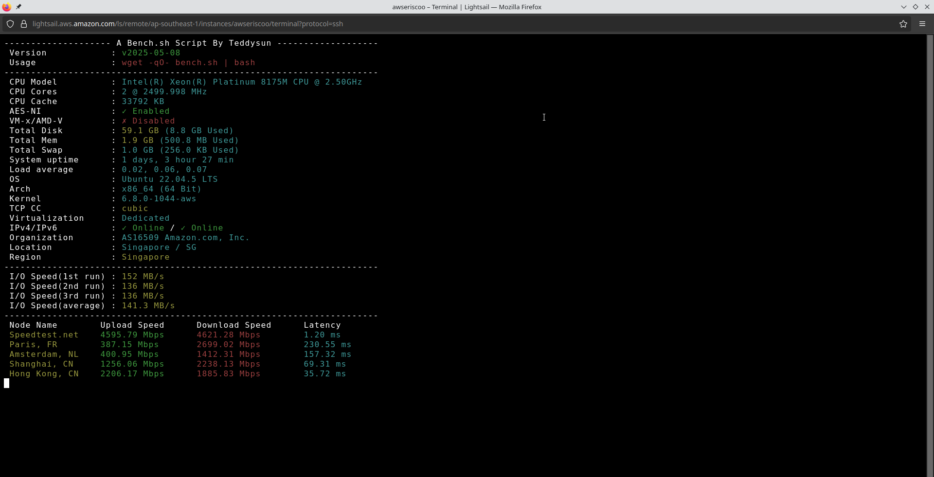 Untuk menjalankan benchmark ini, kita hanya perlu masuk ke VPS melalui SSH dan menjalankan perintah sederhana berikut. Pastikan kita memiliki tool curl yang terinstal di sistem.
